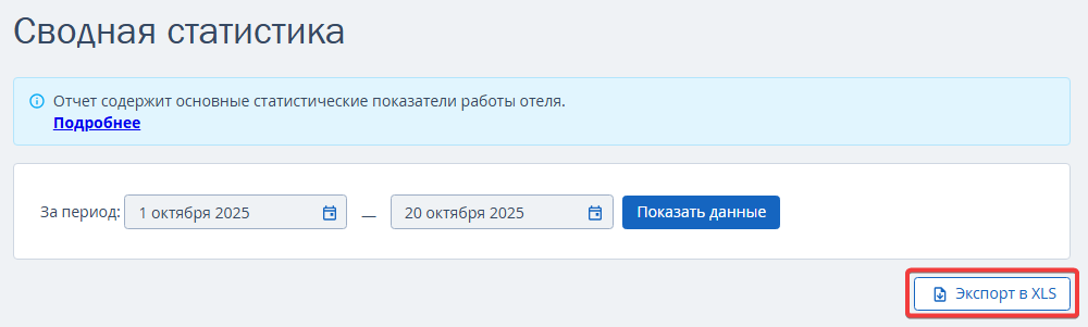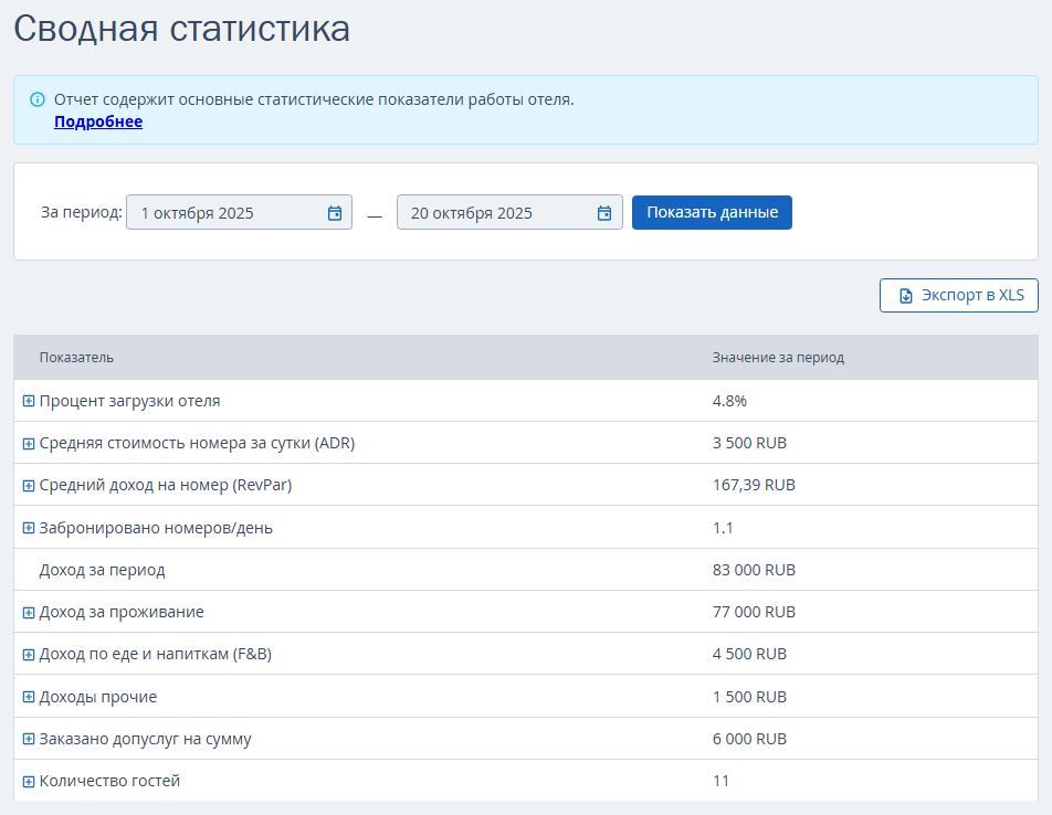 В отчете «Сводная статистика» отображаются основные статистические показатели работы отеля.