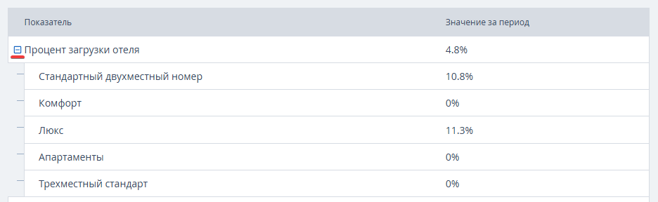 Чтобы просмотреть детализацию по категориям номеров/услугам, нажмите на иконку «+» рядом с нужным показателем. Откроется список категорий/услуг. Напротив каждой категории/услуги вы увидите значение за выбранный период.