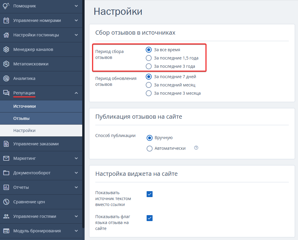 Если выбрано значение «Вручную», то загруженные отзывы будут храниться в разделе «Репутация» → «Отзывы». Публикация отзывов вручную позволяет выбирать конкретные отзывы для публикации в виджете на сайте средства размещения.
