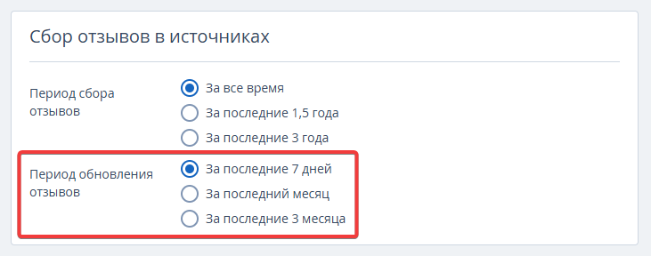 В блоке «Сбор отзывов в источниках» выберите период сбора отзывов. Этот параметр устанавливает период сбора отзывов клиентов с сайтов-источников.