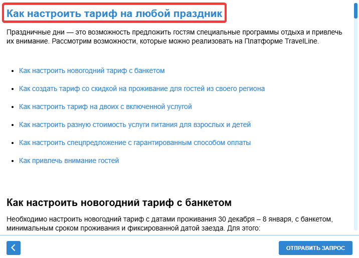 5. Чтобы вернуться к списку статей, нажмите на иконку стрелочки в левом нижнем углу окна. С помощью кнопки «Отправить запрос» вы можете отправить письмо в техподдержку.