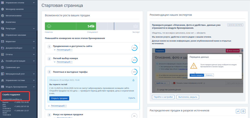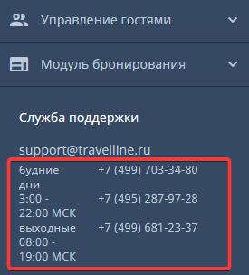 Ответим на срочные вопросы по телефону. В левом нижнем углу экрана личного кабинета TravelLine находятся телефоны техподдержки: +7 (499) 703-34-80, +7 (495) 287-97-28, +7 (499) 681-23-37 (многоканальные). Режим работы техподдержки: в будние дни — с 03:00 до 22:00 МСК, в выходные дни и праздники — с 08:00 до 19:00 МСК.