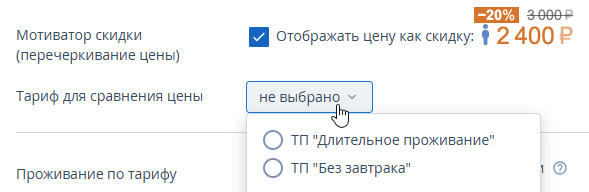 5. Отметьте галочкой опцию «Мотиватор скидки (перечеркивание цены)» и выберите тариф для сравнения цены. В модуле бронирования цена выбранного тарифа будет показана перечеркнутой рядом с ценой данного тарифа.