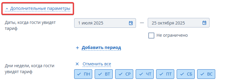 7. Проверьте даты, когда гости могут видеть тариф. Откройте тариф и на вкладке «Оформление тарифа на сайте» кликните на «Дополнительные параметры».