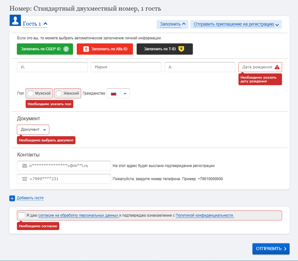3. После заполнения необходимых полей гость завершает регистрацию, нажав кнопку «Отправить».