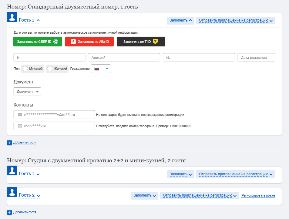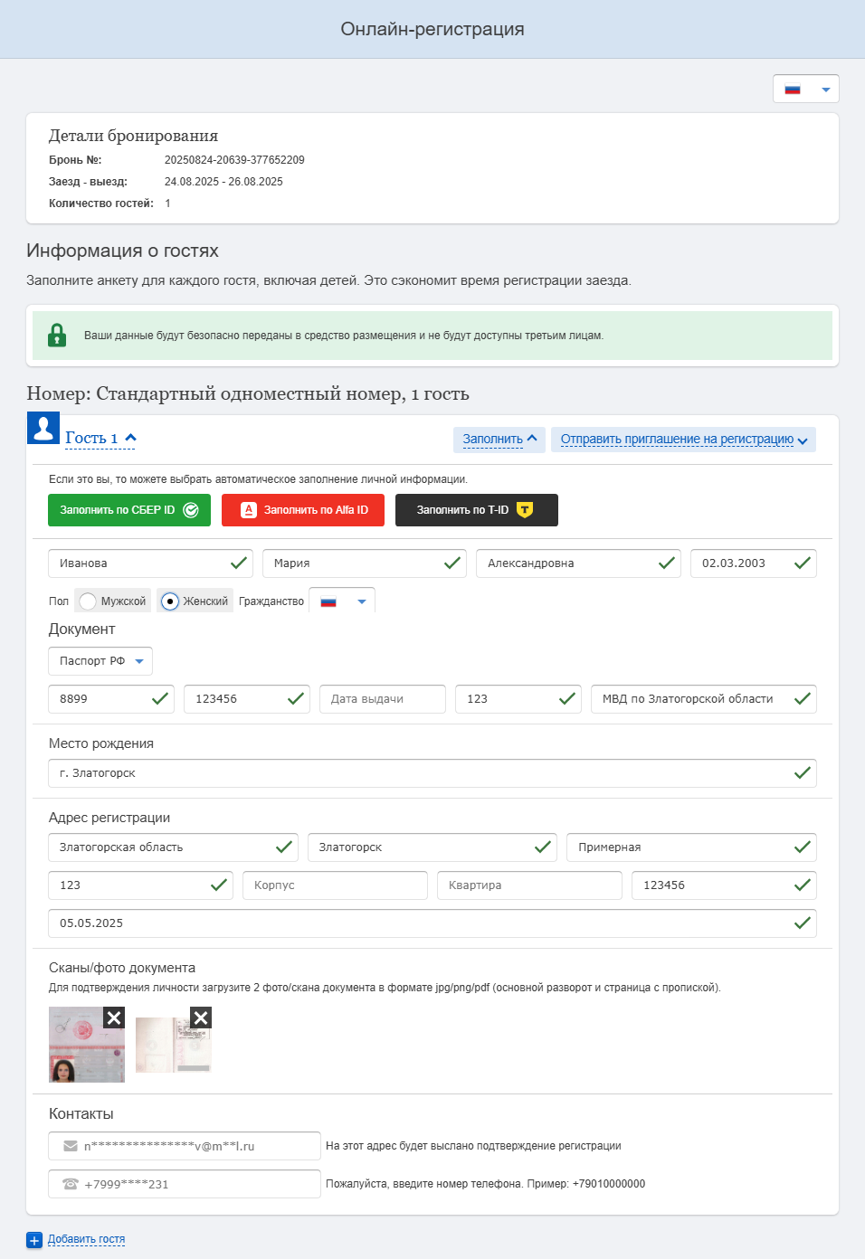 При прохождении онлайн-регистрации гость может автоматически заполнить свои данные через СБЕР ID, Alfa ID или T-ID. Для гостей это более быстрый и удобный способ заполнения данных, а для средства размещения — возможность получить проверенные паспортные данные заранее.