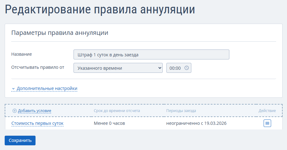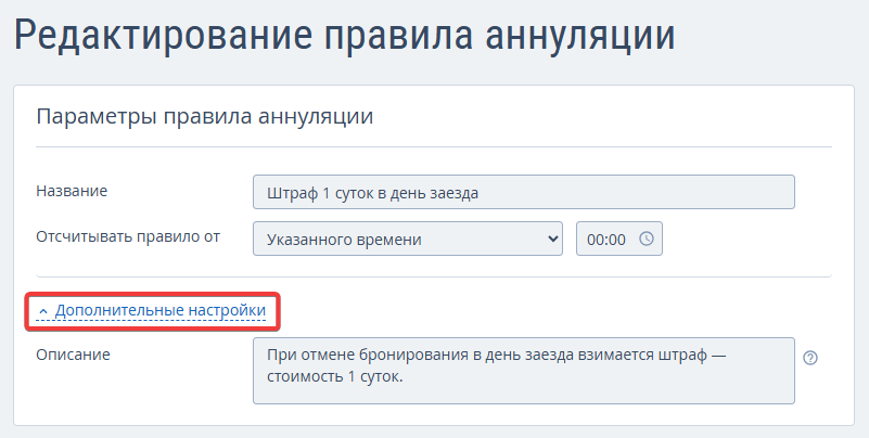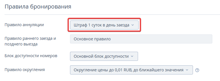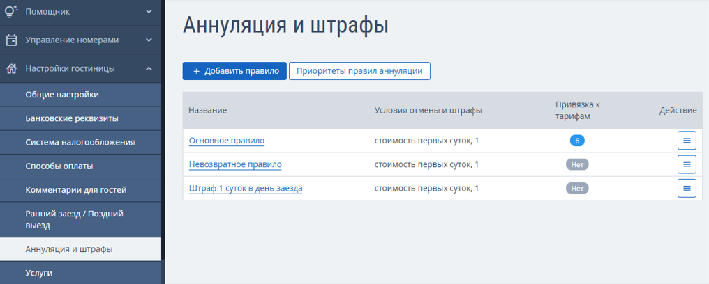 Перейдите в раздел «Настройки гостиницы» → «Аннуляция и штрафы». По умолчанию в личном кабинете созданы три правила: «Основное правило», «Невозвратное правило» и «Штраф 1 суток в день заезда». Их можно изменить вручную — новые условия отобразятся в модуле бронирования.