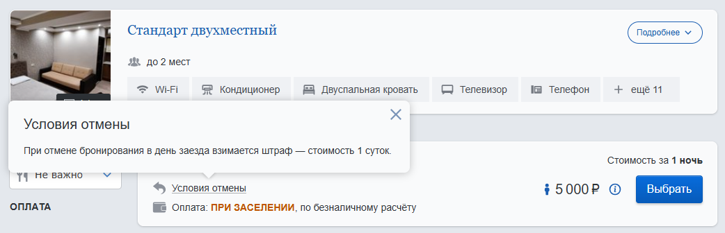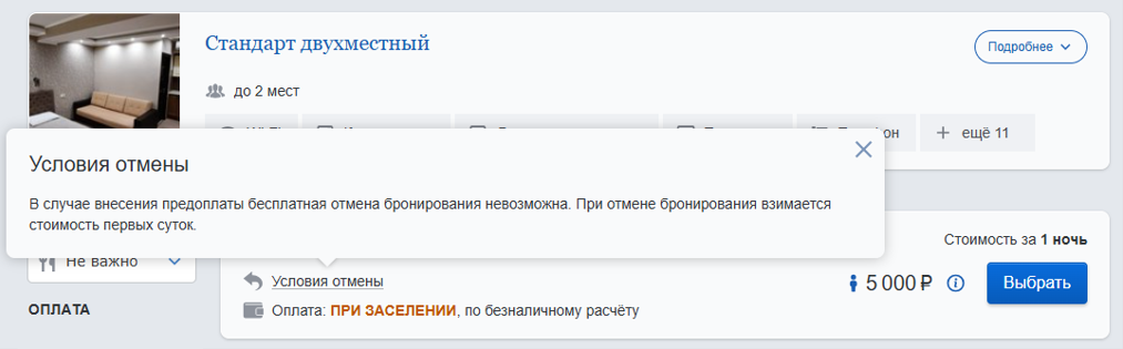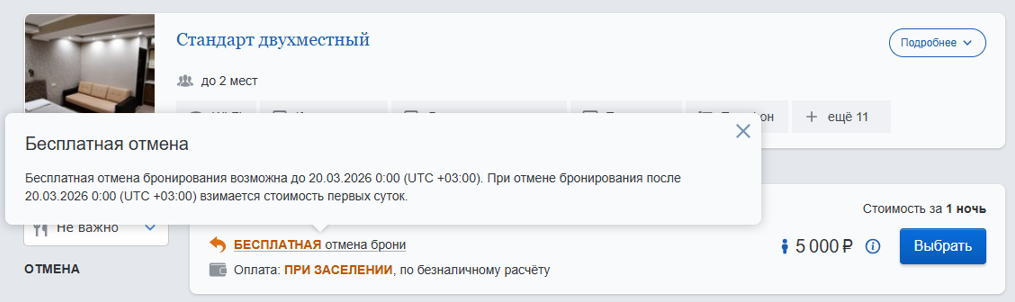 Условия отмены при бронировании в день заезда будут отображаться так:
