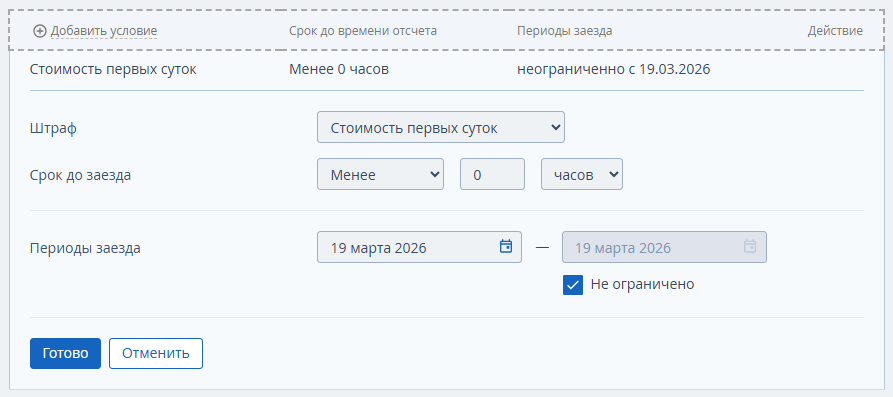 4. В пункте «Периоды заезда» установлен неограниченный период действия начиная с даты создания правила. Если ограничить период действия правила — например, с 19 марта по 1 июня — бронирования с датой заезда вне этого периода автоматически будут считаться нештрафными.