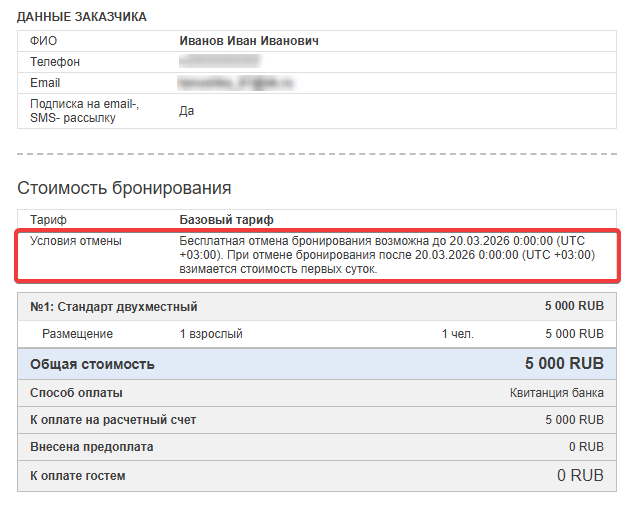 Как выглядит условие аннуляции в подтверждении бронирования гостя