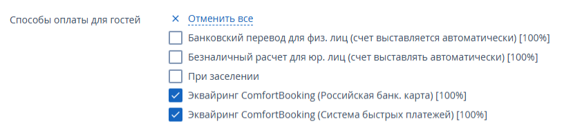 3. На вкладке «Основные настройки» в блоке «Способы оплаты для гостей» выберите гарантированный способ оплаты — оплата 100% суммы через эквайринг.
