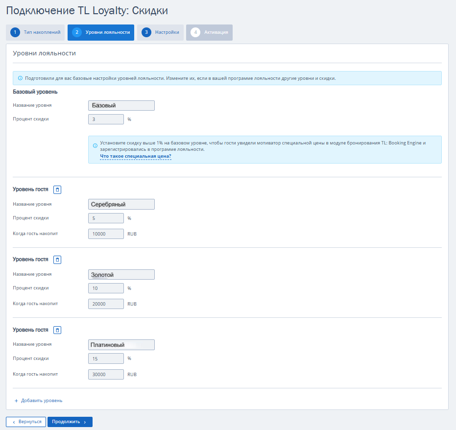 2. На втором шаге добавьте необходимое количество уровней. Для каждого уровня укажите название, процент скидки и порог перехода на этот уровень.