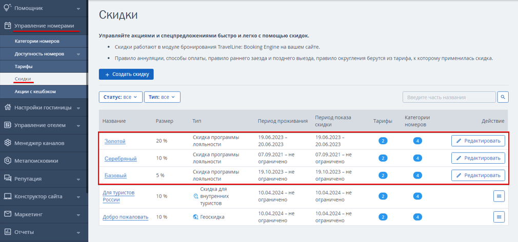 В зависимости от настройки уровней будут автоматически созданы скидки для модуля бронирования в разделе «Управление номерами» → «Скидки». При регистрации на сайте в модуле бронирования гости смогут получить скидку, соответствующую их уровню в программе лояльности.
