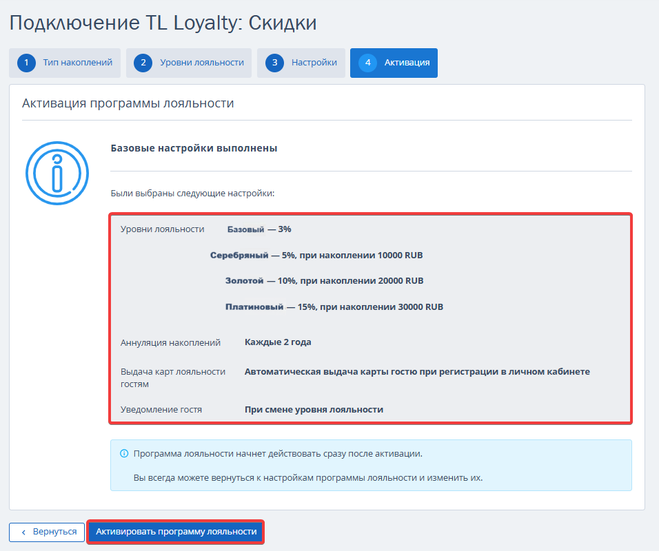 Перед активацией проверьте выбранные настройки и нажмите кнопку «Активировать программу лояльности».