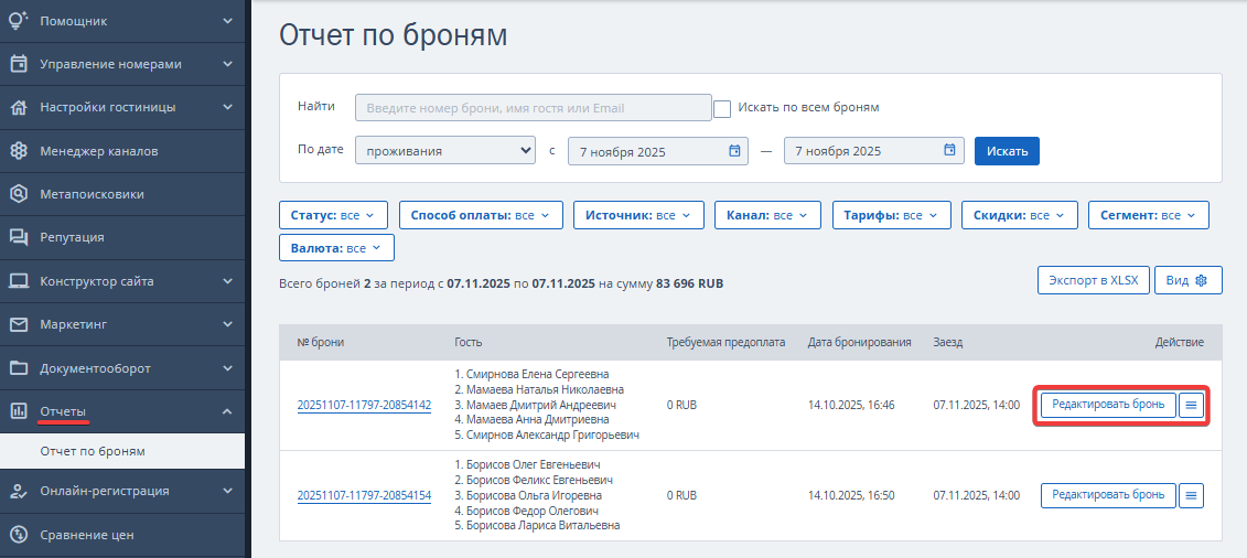 1. В личном кабинете TravelLine перейдите в раздел «Отчеты» → «Отчеты по броням». С помощью фильтров найдите бронирование, которое хотите изменить.