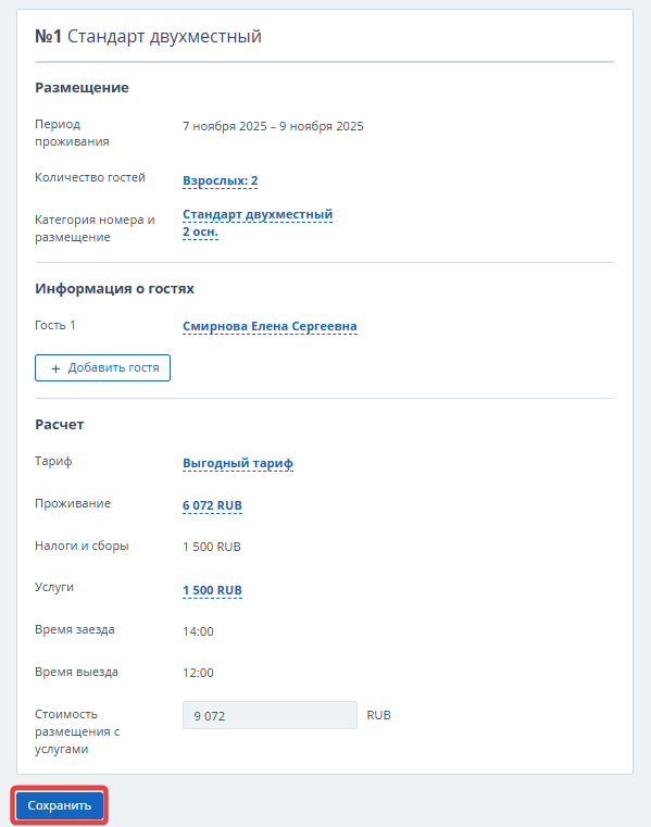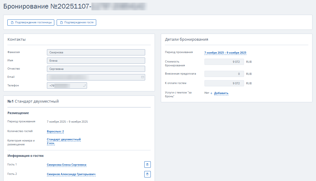Обратите внимание. Удаление гостя не влияет на стоимость бронирования. То есть, если гость забронировал проживание на двоих в двухместном номере, и один гость не смог приехать, другой гость будет проживать в номере со стоимостью для двоих гостей. Если необходимо изменить стоимость бронирования, воспользуйтесь инструкцией «Как изменить стоимость в бронировании с сайта».