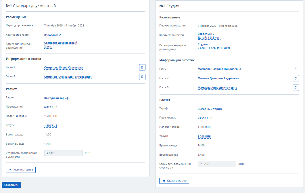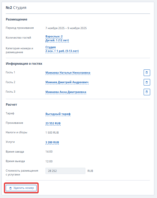 После удаления номера в бронировании будут отображаться данные гостя только из оставшегося номера.
