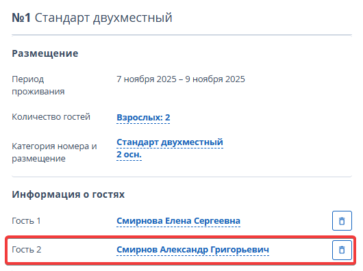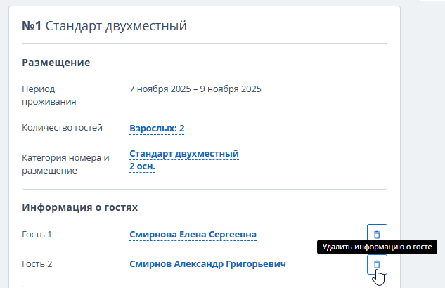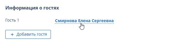 В блоке «Информация о гостях», если нажать на имя, можно изменить имя, фамилию и отчество гостя.