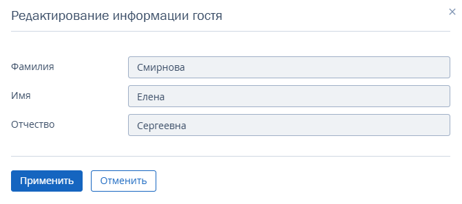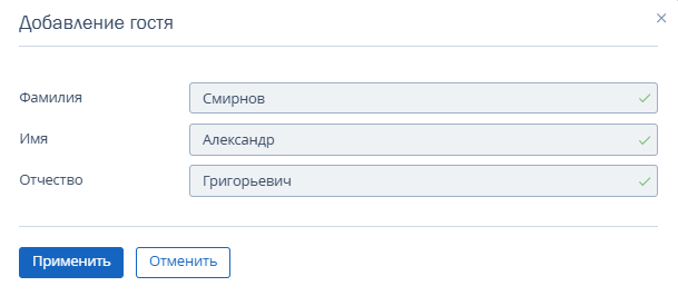 В окне «Добавление гостя» заполните поля: «Фамилия», «Имя» и «Отчество», нажмите «Применить».