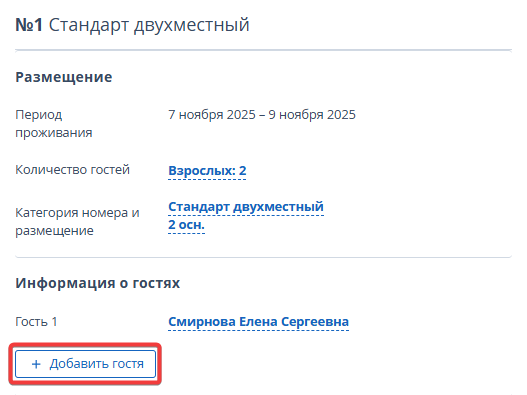 Если при бронировании гость указал данные не всех гостей, в блоке «Информация о гостях» появится кнопка «Добавить гостя».