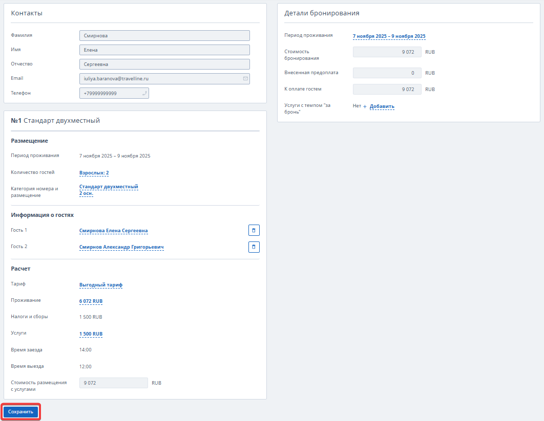 ФИО, email и телефон гостя, который забронировал проживание, можно изменить в блоке «Контакты».