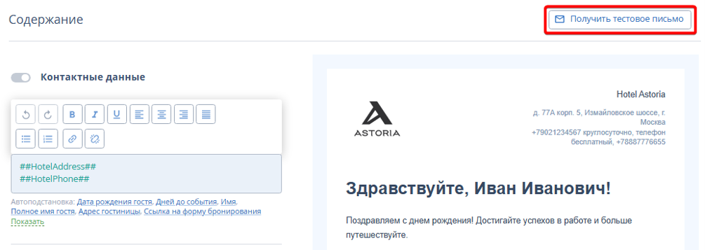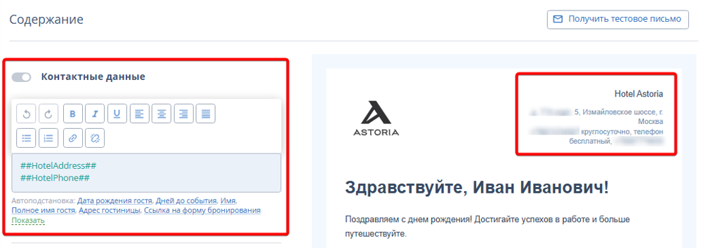 Пункт «Контактные данные» содержит адрес и номер телефона средства размещения, которые отображаются в шапке письма.