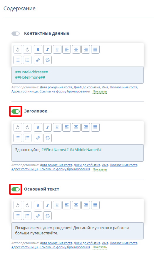 В блоке «Содержание» измените положение переключателя, чтобы скрыть или добавить необходимые блоки письма.