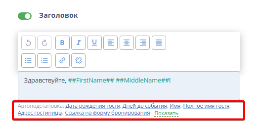 Пункт «Заголовок» включает обращение к гостю.
