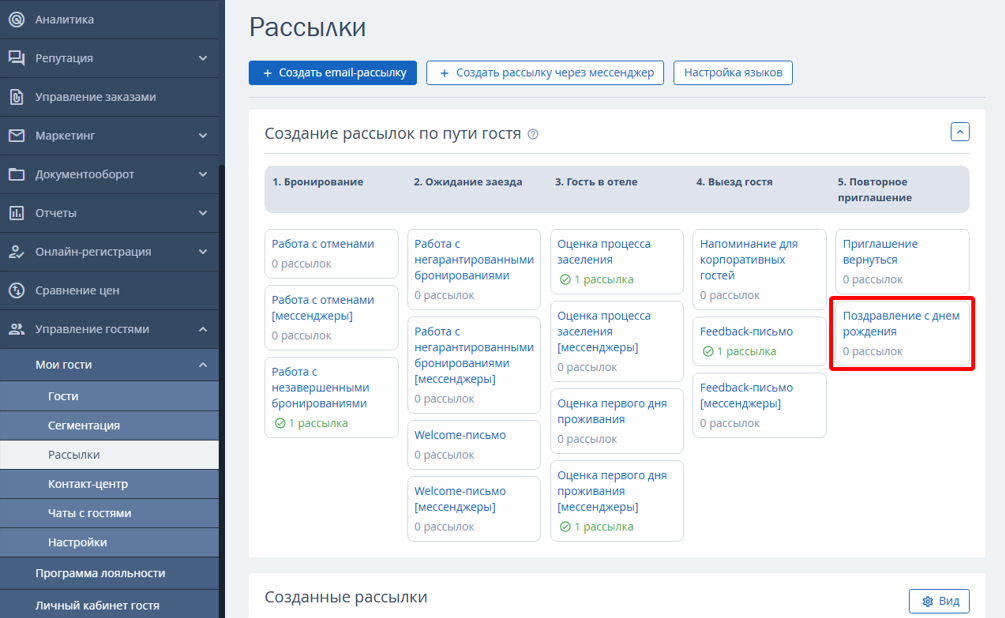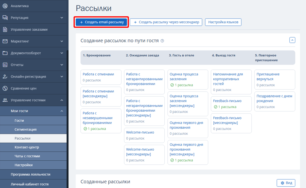 1. Перейдите в личный кабинет TravelLine → «Управление гостями» → «Мои гости» → «Рассылки» и нажмите необходимую рассылку в блоке «Создание рассылок по пути гостя».