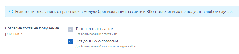 - Гости, которые отказались от рассылок при бронировании на сайте, мобильной версии сайта и ВКонтакте, — не будут получать рассылки при любых настройках.
