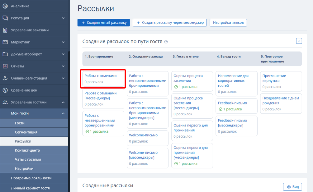 1. Перейдите в личный кабинет TravelLine → «Управление гостями» → «Мои гости» → «Рассылки» и нажмите необходимую рассылку в блоке «Создание рассылок по пути гостя».