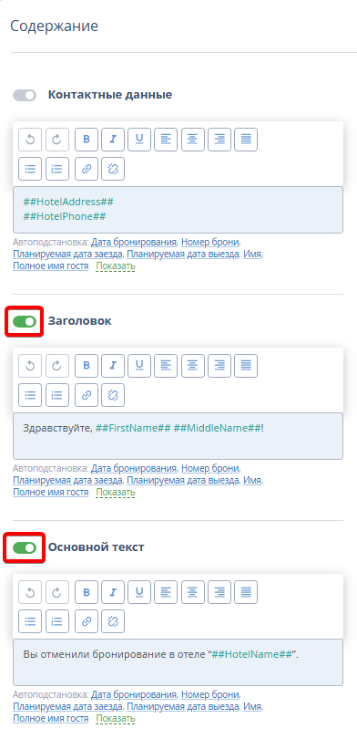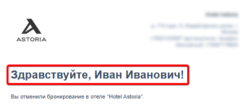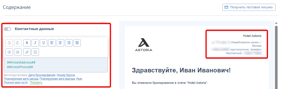 Пункт «Контактные данные» содержит адрес и номер телефона средства размещения, которые отображаются в шапке письма.