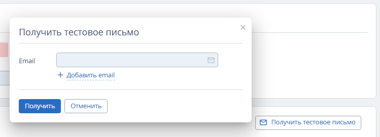 После сохранения нажмите кнопку «Получить тестовое письмо» и укажите один или несколько email-адресов в открывшемся окне. Нажмите кнопку «Получить».