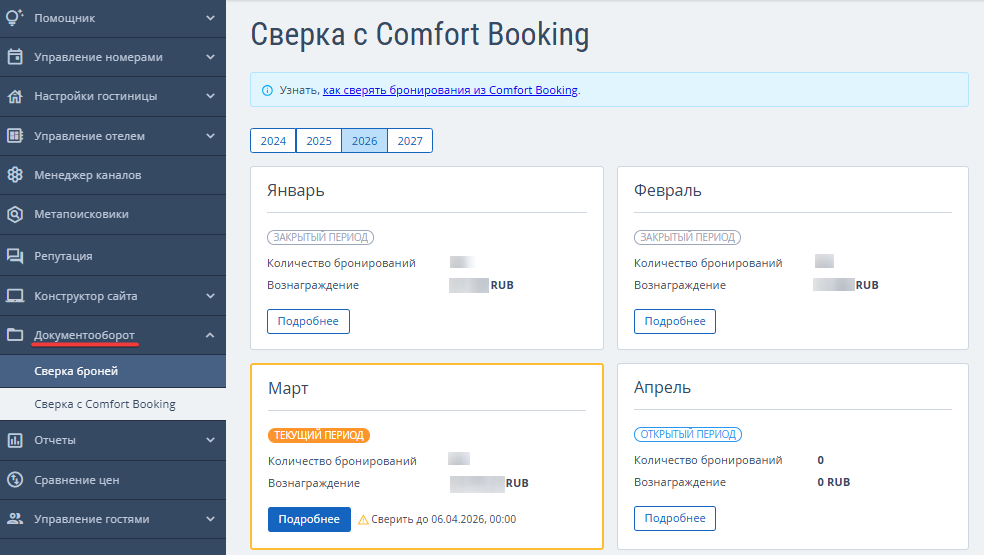 После закрытия сверки формируются все необходимые закрывающие документы, которые доступны в личном кабинете ООО «Комфорт Букинг». Подробности читайте в статье «Агрегатор каналов Comfort Booking».