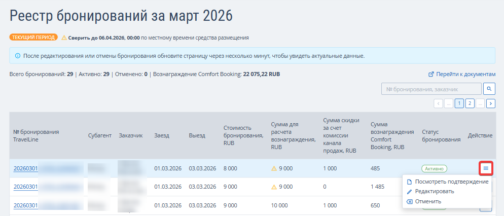 Обратите внимание. Действия «Редактировать» и «Отменить» доступны для текущей и будущих сверок. В прошедших месяцах доступно только одно действие «Посмотреть подтверждение». Если бронь отменена, то в действиях доступен только просмотр подтверждения бронирования.