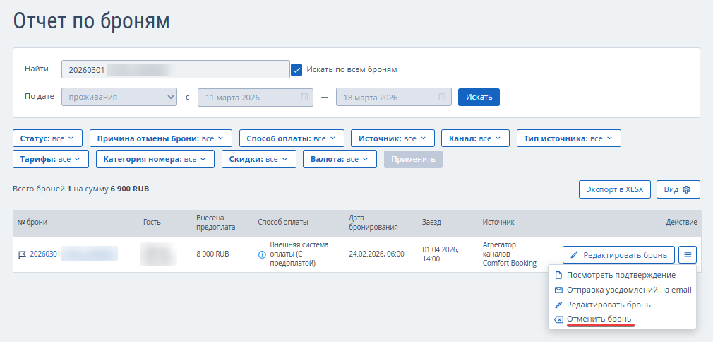 На странице реестра бронирований вам доступны следующие действия: