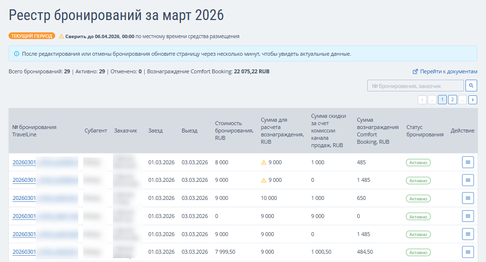 - если отмена была со штрафом, бронь будет отображаться в разделе «Документооборот» → «Сверка с Comfort Booking», сумма вознаграждения по этой брони будет начислена.
