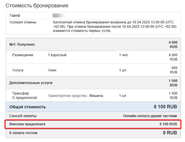 Например, гость забронировал проживание на 2 ночи стоимостью 2000 рублей и внес предоплату 1000 рублей. Затем гость изменил бронирование и добавил еще одну ночь. При этом стоимость брони стала 3000 рублей, а второй платеж составил 2000 рублей.