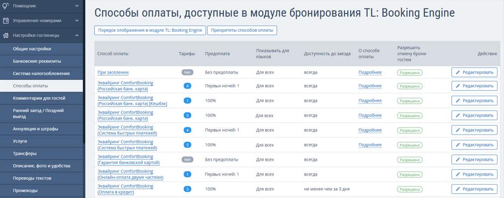 1. Перейдите в раздел «Настройки гостиницы» → «Способы оплаты».