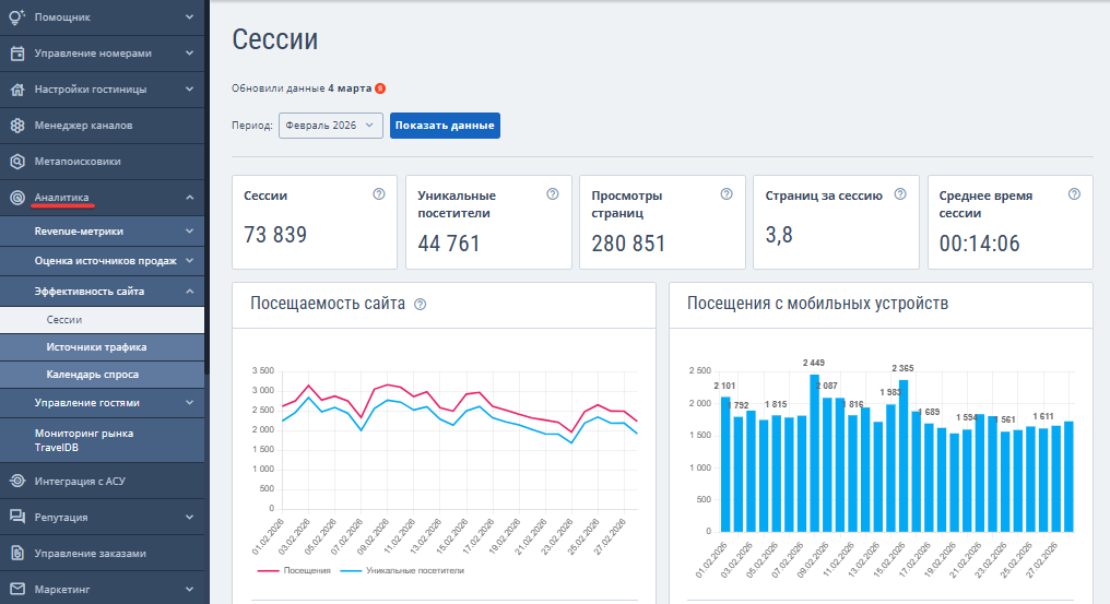 1. В личном кабинете TravelLine перейдите в раздел «Аналитика» → «Эффективность сайта» → «Сессии».