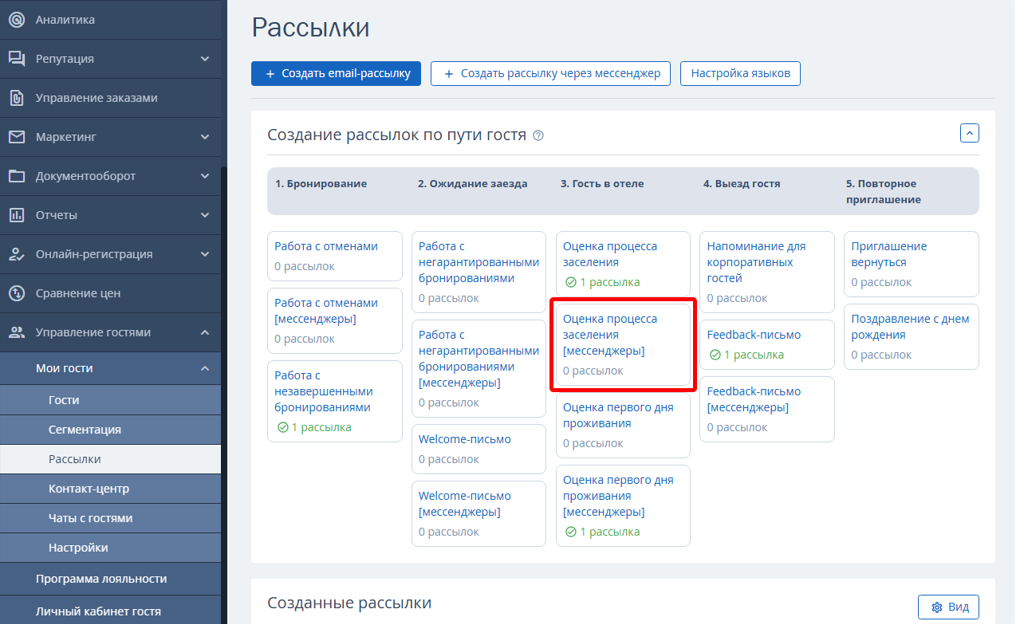 - Из блока «Создание рассылок по пути гостя» → «Оценка процесса заселения [мессенджеры]».