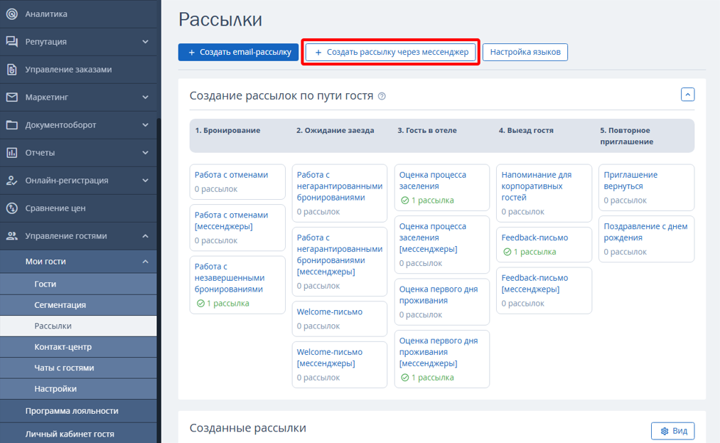 1. Перейдите в личный кабинет TravelLine → «Управление гостями» → «Мои гости» → «Рассылки».